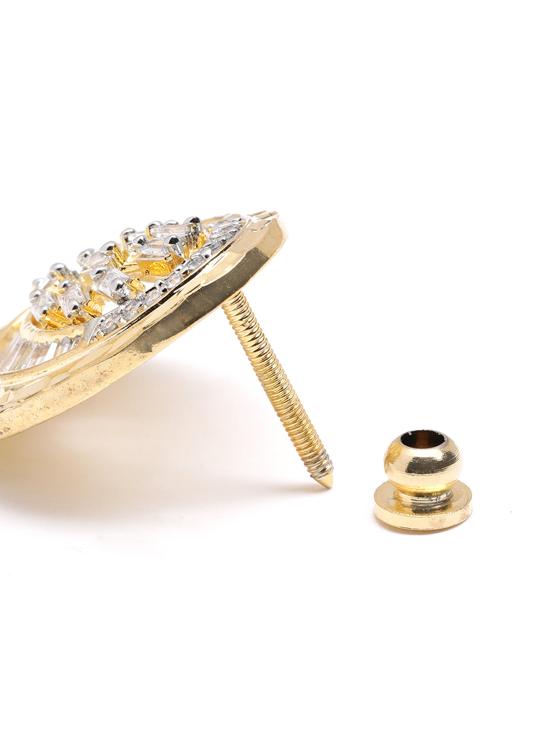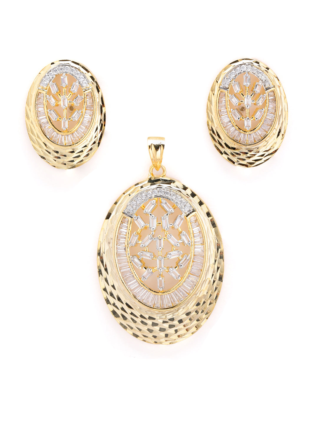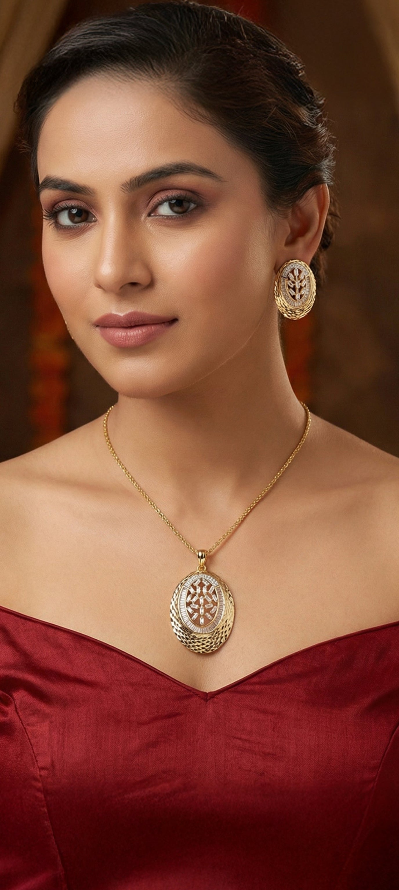 A royal american diamond pendant set crafted in a bold oval design, highlighted with baguette-cut brilliance, shimmering AAA cubic zircon stones, and golden accents. A true statement piece that blends traditional charm with modern elegance. Secured with screw-back closure. This Pendant necklace for women comes with AAA cubic zircon pendant and a pair of matching earrings. It has 1 year plating warranty and is anti-tarnish for lasting shine and comfort.
