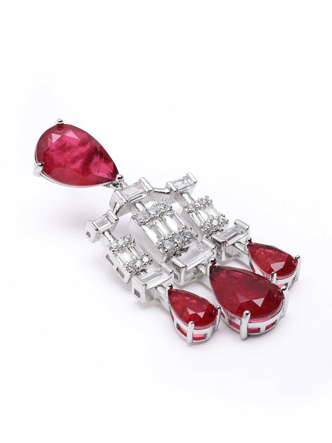 A statement pair of chandelier earrings featuring rich crimson teardrop doublet stones suspended beneath an intricate geometric arrangement of sparkling crystals. The structured silhouette paired with fluid drops creates a captivating play of light and movement. Designed for grand occasions, weddings, and evening celebrations, these earrings embody timeless glamour with a bold, regal presence.