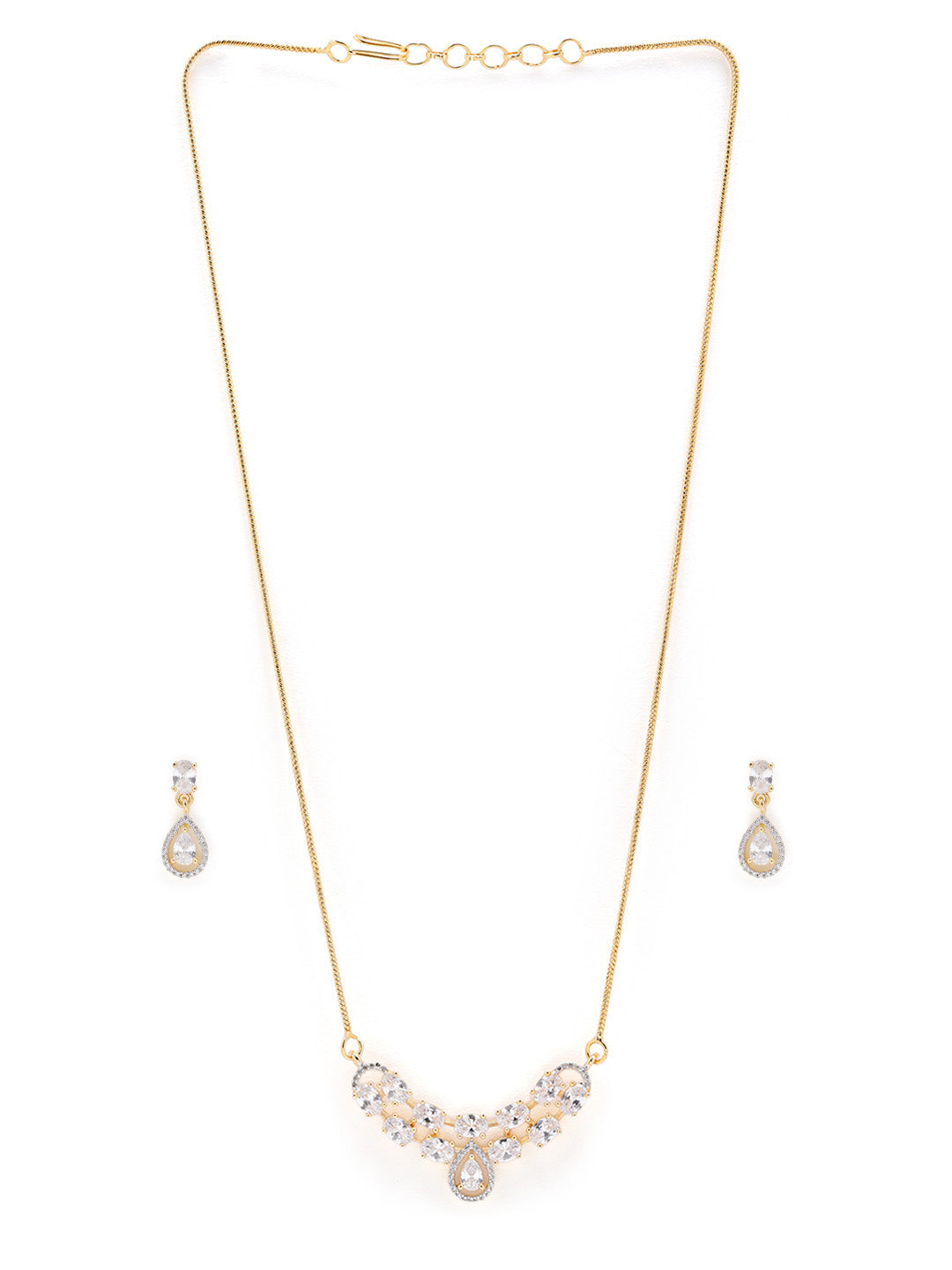 A delicate necklace set featuring a refined gold-tone chain adorned with shimmering crystal accents and a graceful teardrop pendant. Paired with matching drop earrings, this elegant design offers a perfect balance of subtle sparkle and timeless charm. Ideal for weddings, festive occasions, and sophisticated evening wea