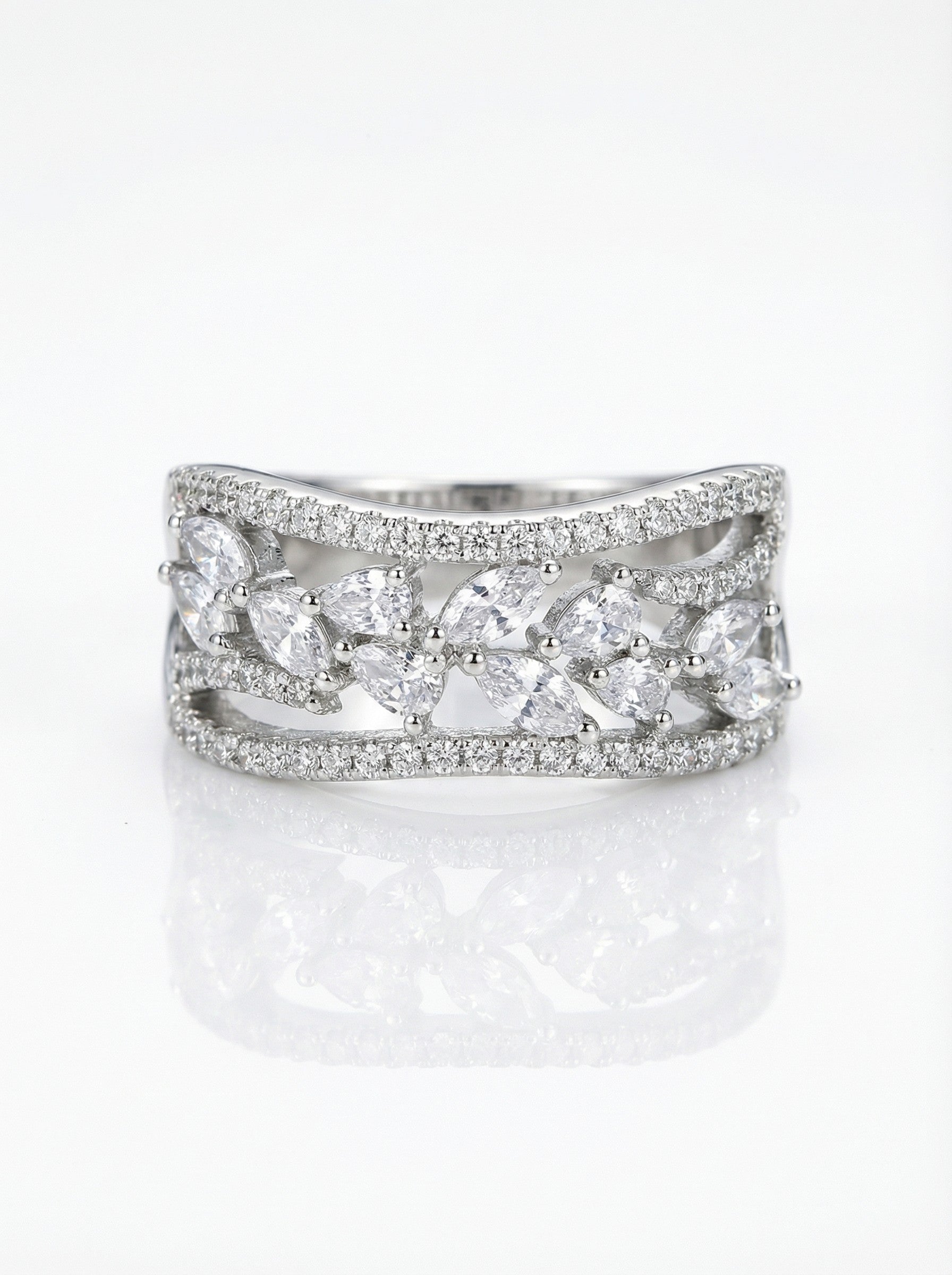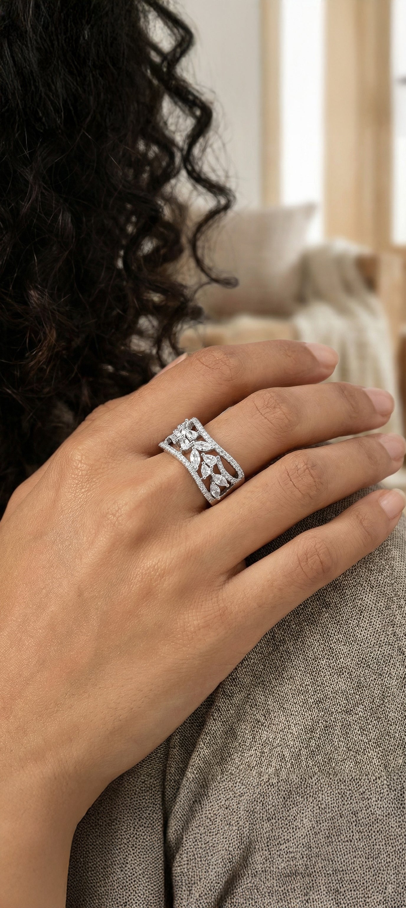Elevate your jewellery collection with this elegant silver-tone band ring, designed with a striking leaf-inspired pattern at the center. Sparkling clear crystals are set along the leaves and bordered by a double row of shimmering stones, creating a luxurious and eye-catching finish. The detailed craftsmanship and balanced design make this ring perfect for festive wear, parties and gifting.