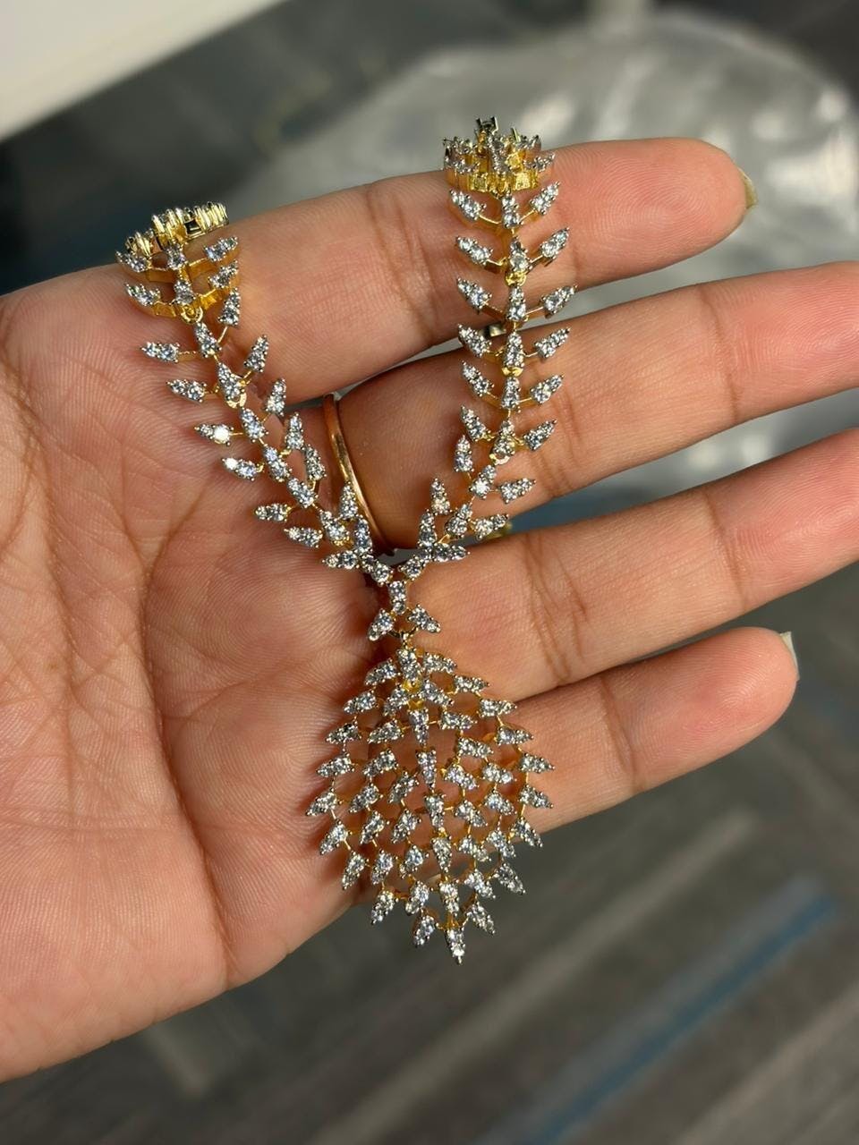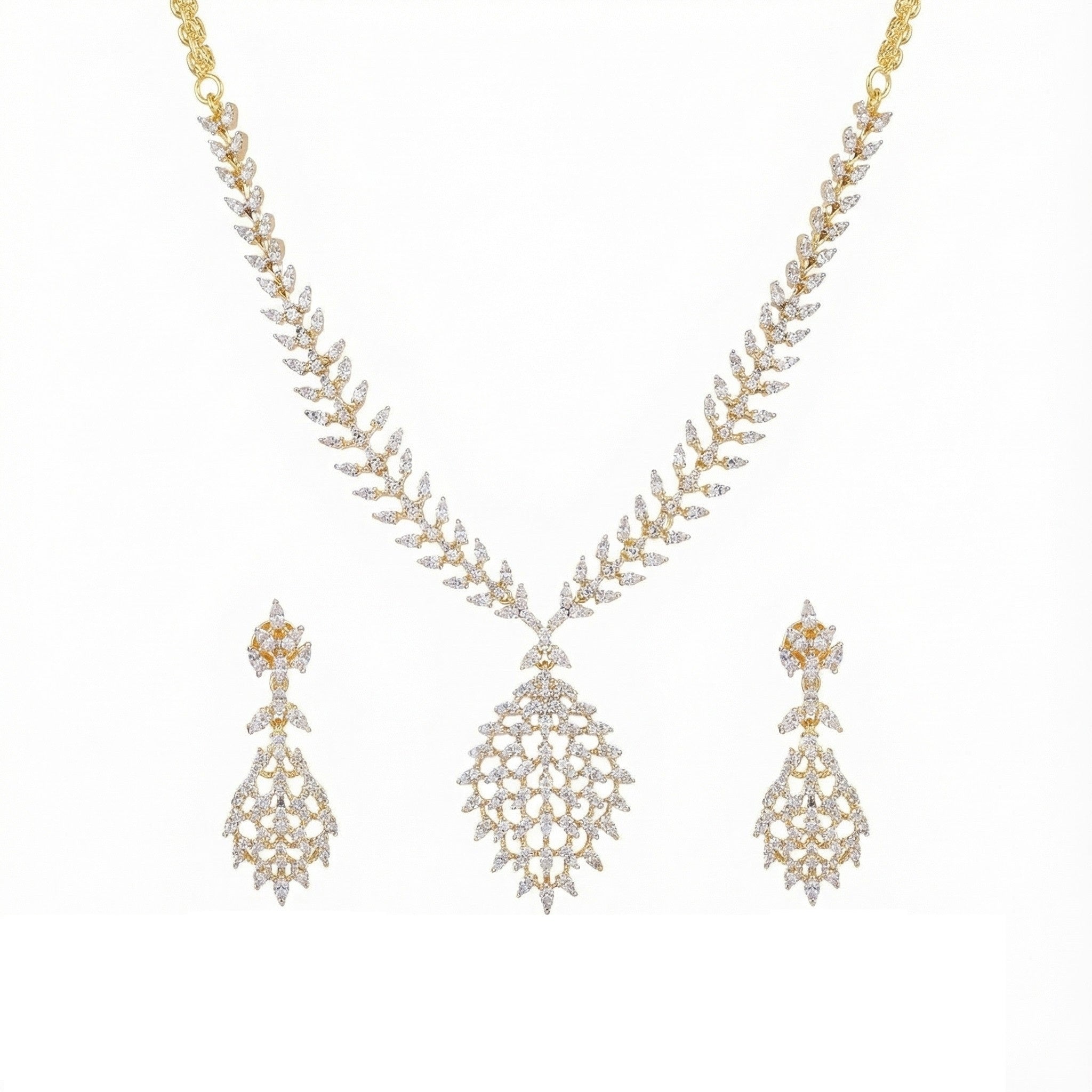 A stunning gold-based AAA Cubic Zircon studded necklace set, featuring delicate diamond-like stones set in a leafy vine design. The intricate pendant flows down in a graceful cascade, adding an elegant sparkle to your neckline. Perfect for festive evenings or wedding functions, it blends classic charm with a modern twi