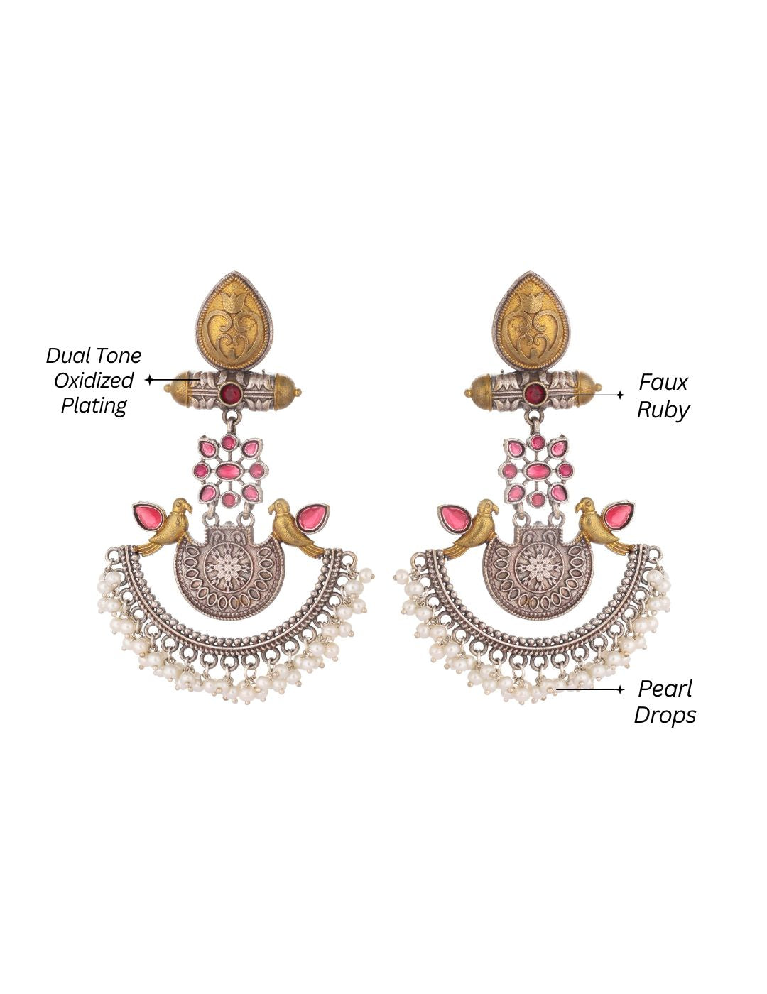 A stunning pair of oxidized chandbali adorned with red stones, intricate motifs, and delicate pearl hangings. The dual-tone finish of silver and gold adds a rich, timeless charm to this ethnic beauty. A regal design that blends tradition with grandeur, these earrings are perfect for weddings, sangeet nights, and festiv