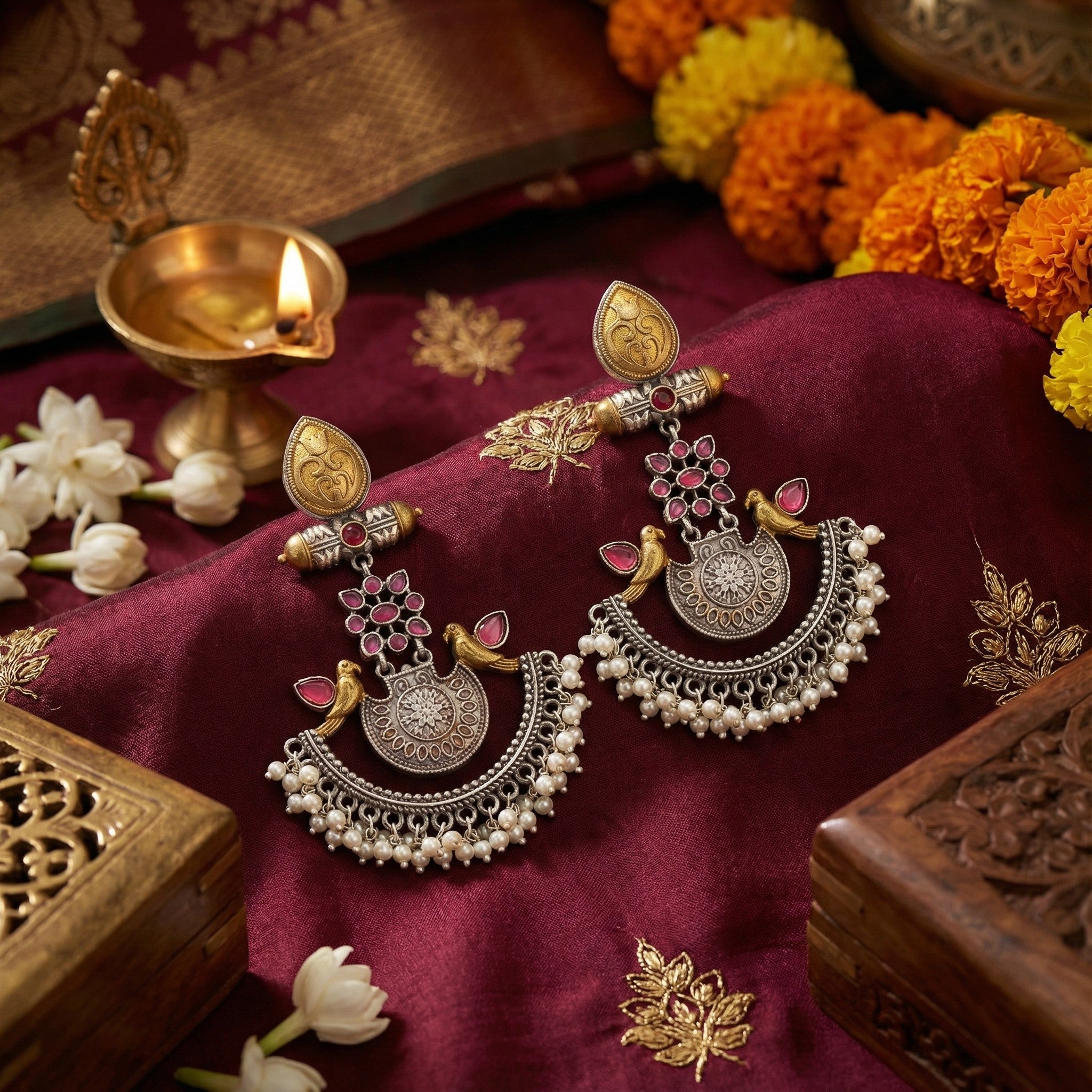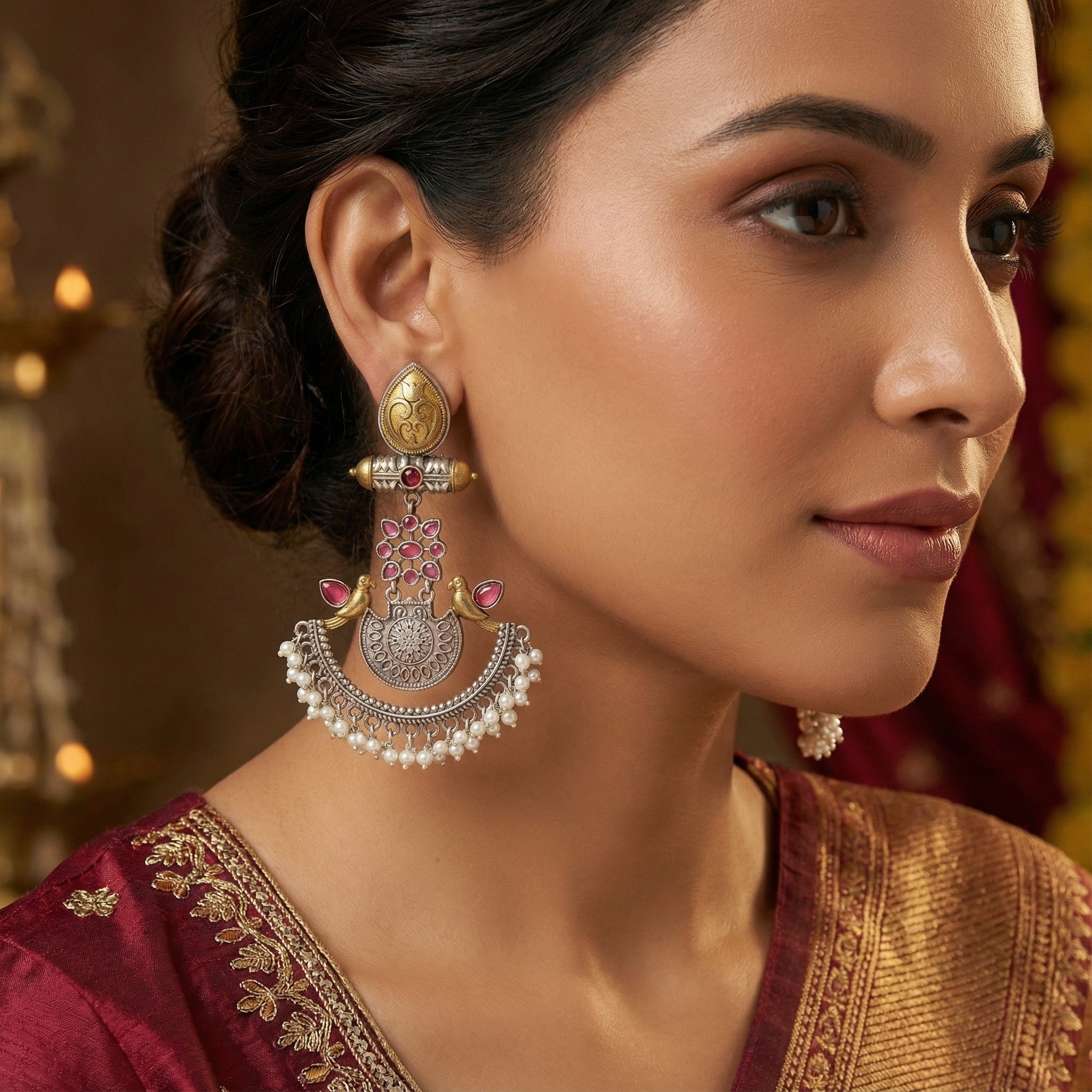 A stunning pair of oxidized chandbali earrings for women adorned with red stones, intricate motifs, and delicate pearl hangings. The dual-tone finish of silver and gold adds a rich, timeless charm to this ethnic beauty. A regal design that blends tradition with grandeur, these earrings are perfect for weddings, sangeet