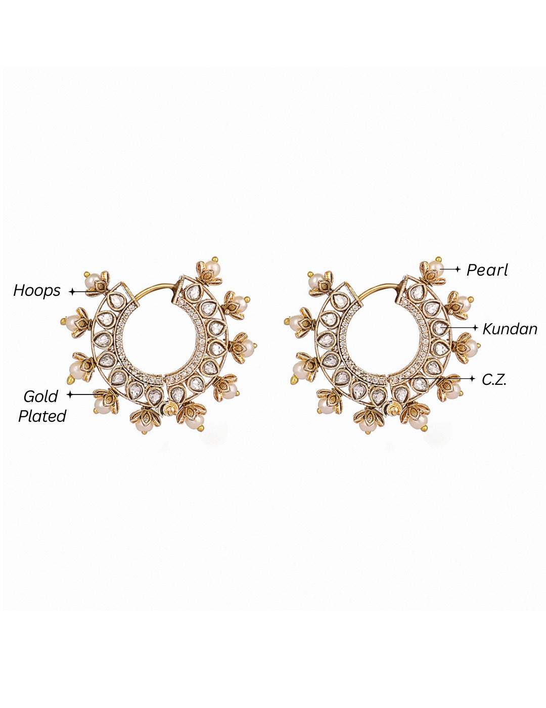 Gold toned, A vibrant hoop earrings adorned with pearl-hued teardrop stones, surrounded by miniature gold florals and pearl droplets. The structured yet delicate design channels festive grandeur, ideal for bridal events or traditional celebrations. Secured with lever back closure. This comes with 1 year plating warrant