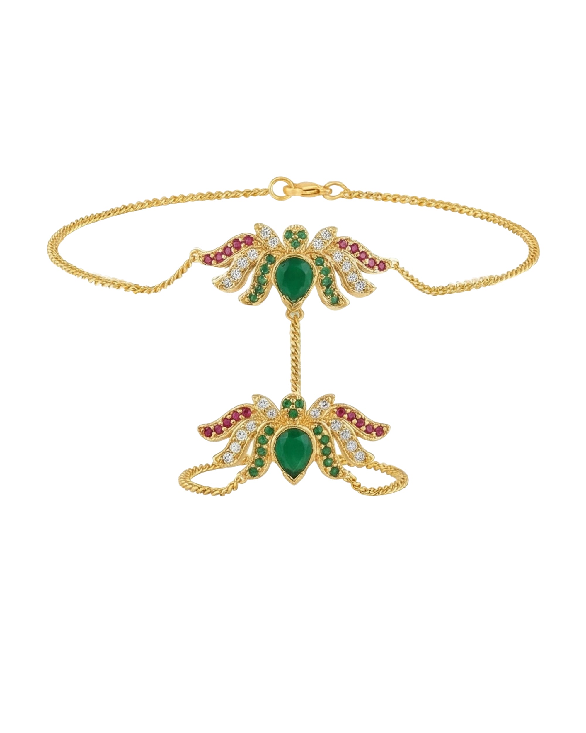 Gold toned, inspired by the beauty of the lotus, this graceful hathphool features a vibrant floral centre piece with green and ruby accents. Elegant pearl detailing and sleek gold chains enhance its regal appeal. Secured with S-hook closure. This comes with 1 year plating warranty and anti-tarnish for lasting shine and
