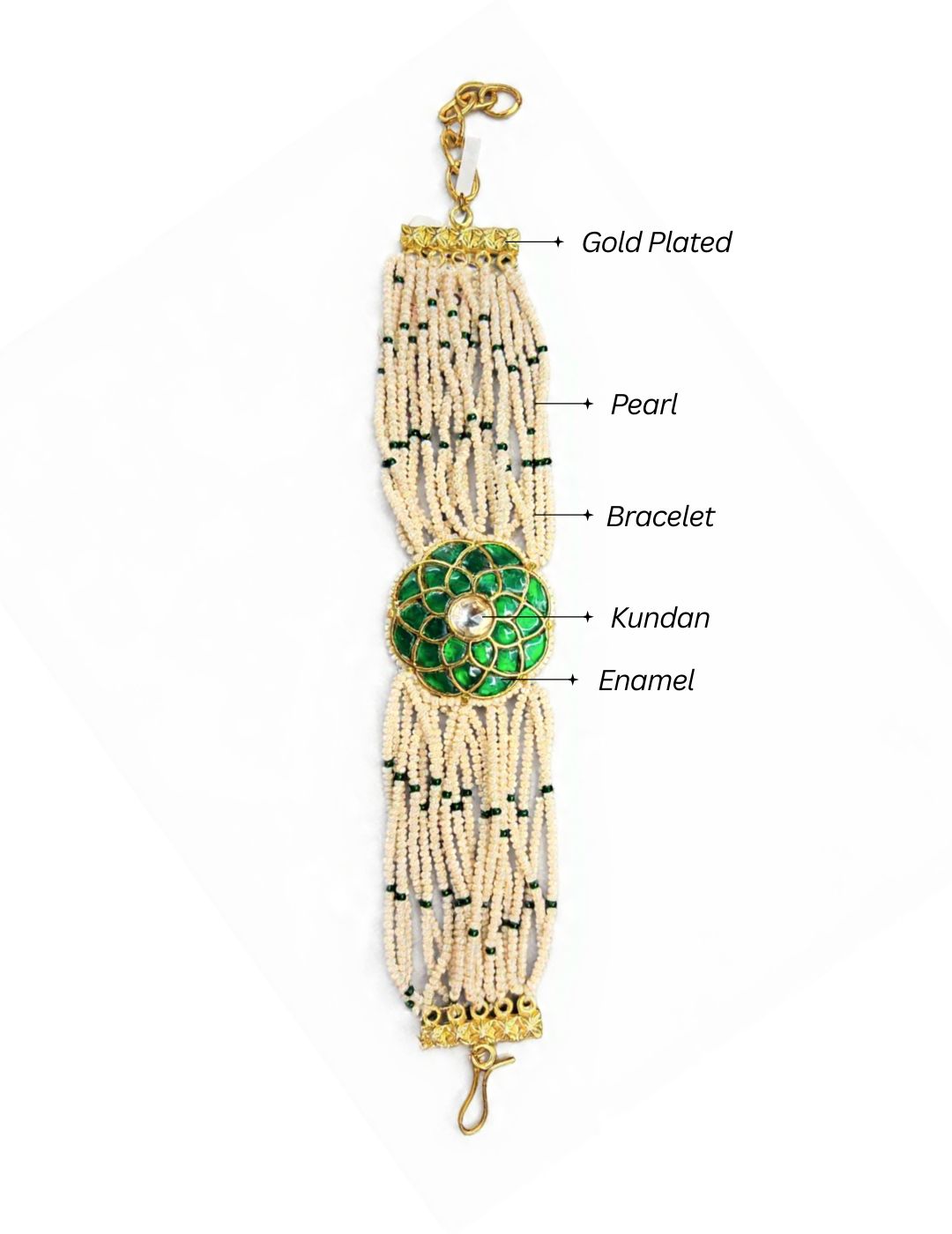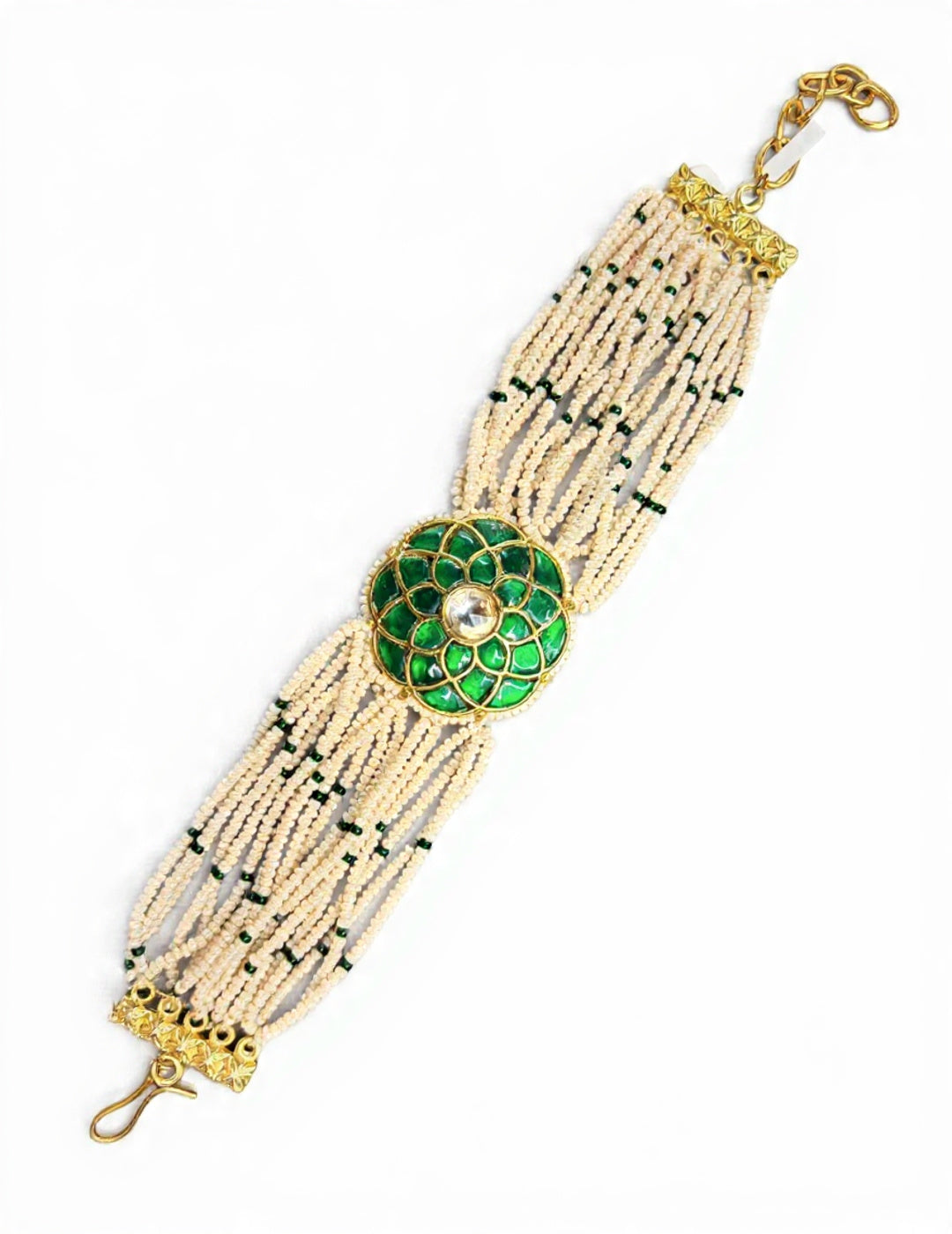 22K Gold toned, this bracelet showcases a radiant circular motif adorned with kundan stones. Three strands of faceted green beads that shimmer with elegance. The golden accents and crescent-shaped connectors enhance the regal aesthetic, making it a timeless piece to elevate any ethnic outfit. Secured with S-hook closure. This comes with 1 year plating warranty, anti-tarnish for lasting shine and comfort.