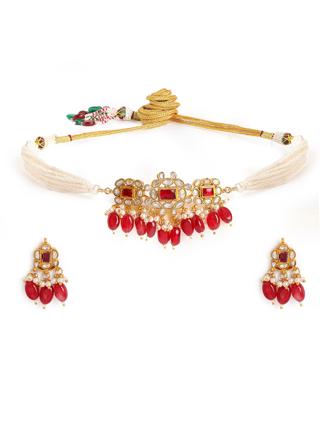 22K Gold Plated, this ethereal set features blend of multi-strand pearls, kundan motifs, and rich ruby-red gemstone drops. With its opulent finish, this piece is crafted for weddings, festive occasions, and bridal celebrations.Secured with adjustable drawstring closure. This comes with 1 year plating warranty, anti-tar