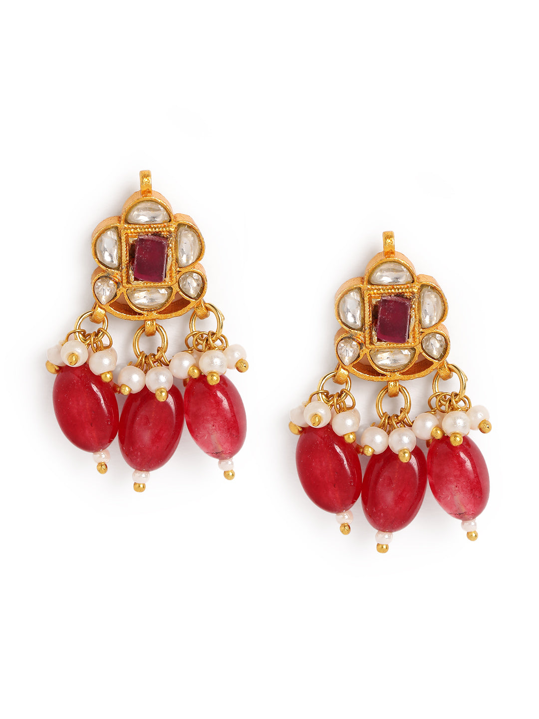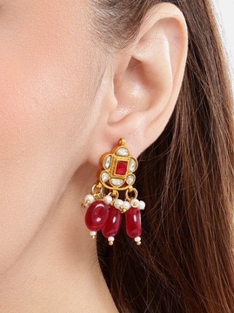 22K Gold Plated, this ethereal set features blend of multi-strand pearls, kundan motifs, and rich ruby-red gemstone drops. With its opulent finish, this piece is crafted for weddings, festive occasions, and bridal celebrations.Secured with adjustable drawstring closure. This comes with 1 year plating warranty, anti-tarnish for lasting shine and comfort.