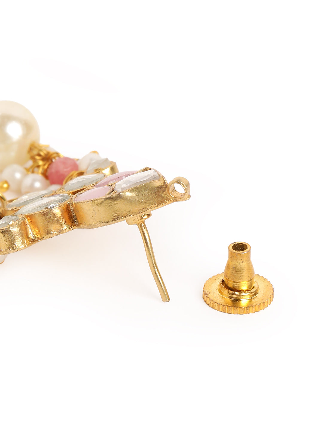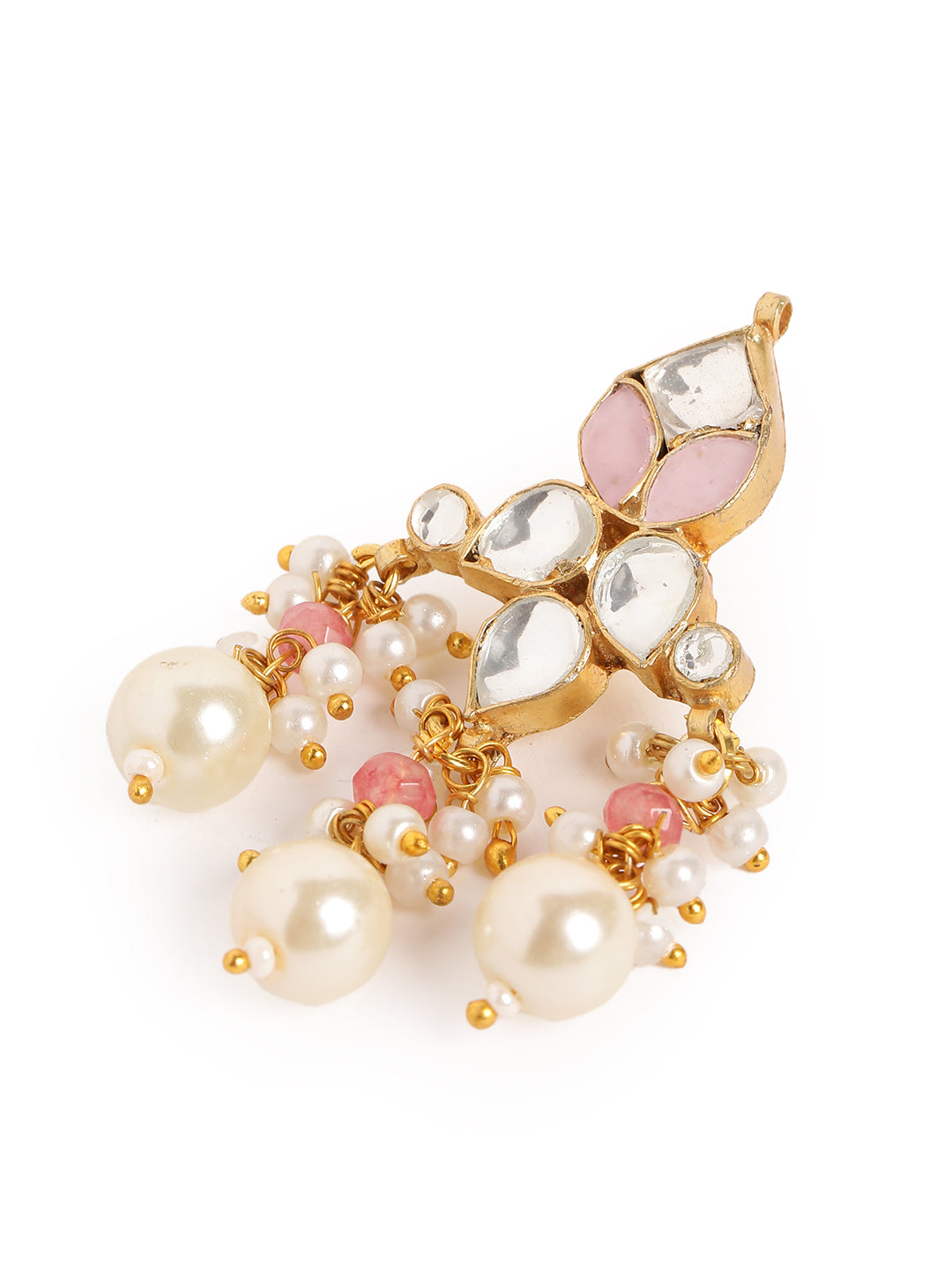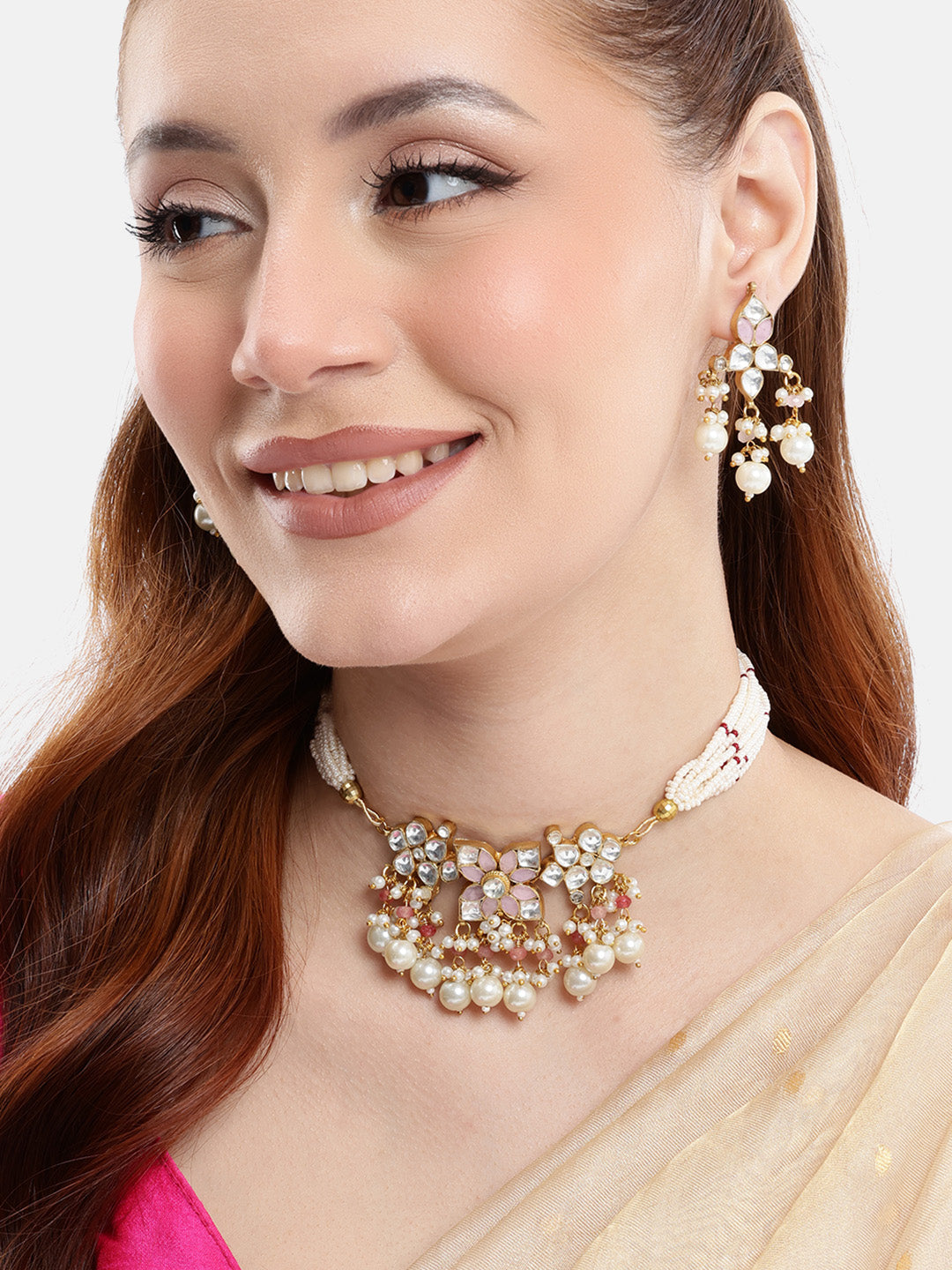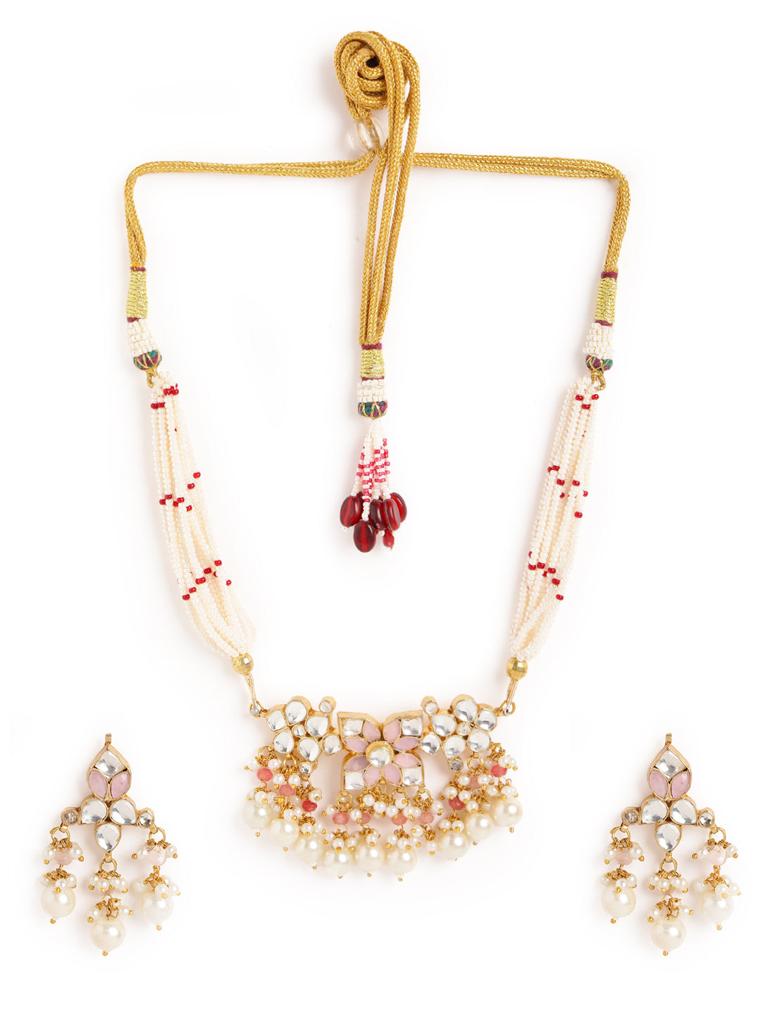 Add regal glamour to your wardrobe with this 22K gold-plated semi-precious stone necklace set. Adorned with intricate semi-precious rose quartz stones, complemented by Kundan, pearl and enamel detailing, this set includes a stunning necklace with matching drop earrings. Secured with adjustable drawstring closure. This comes with 1 year plating warranty, anti-tarnish for lasting shine and comfort.