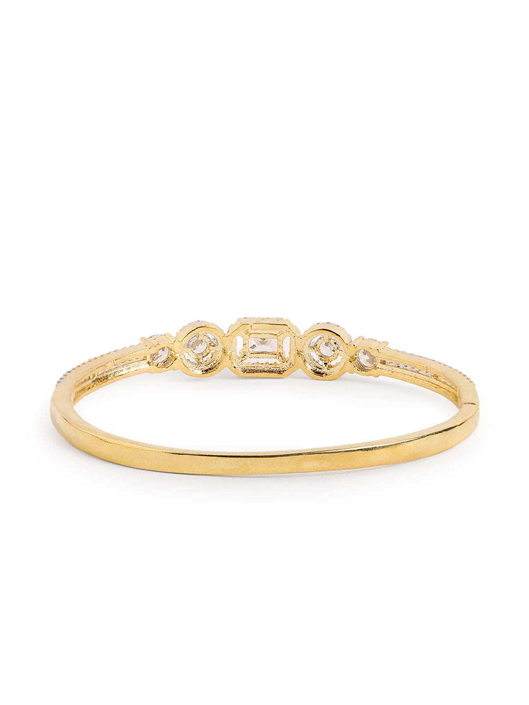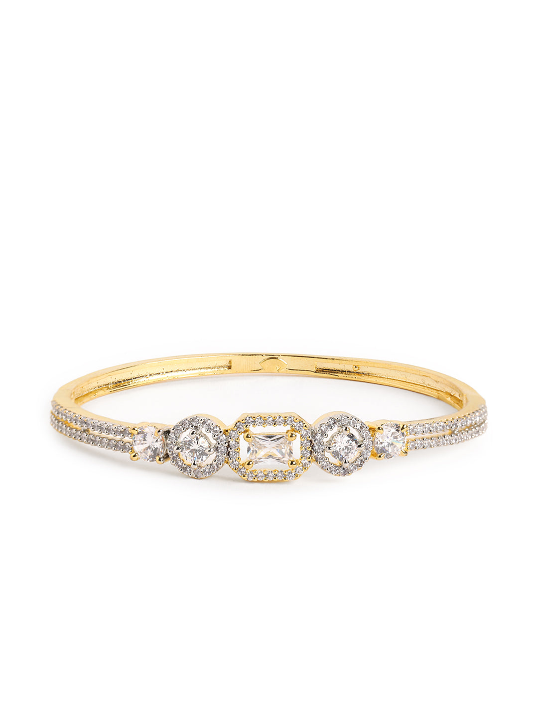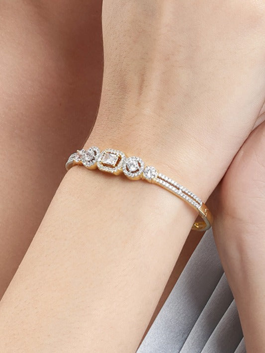 Shine with timeless elegance in this halo-studded bracelet, featuring alternating round and square cut AAA Cubic Zircon stones framed with shimmering crystals. Its refined design and luxurious finish make it the perfect statement piece for weddings, cocktail nights, or festive occasions. Secured with clip on closure. This comes with 1 year plating warranty, anti-tarnish for lasting shine and comfort. Size upto 2.6