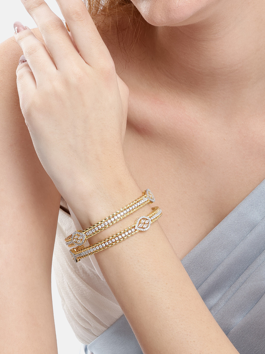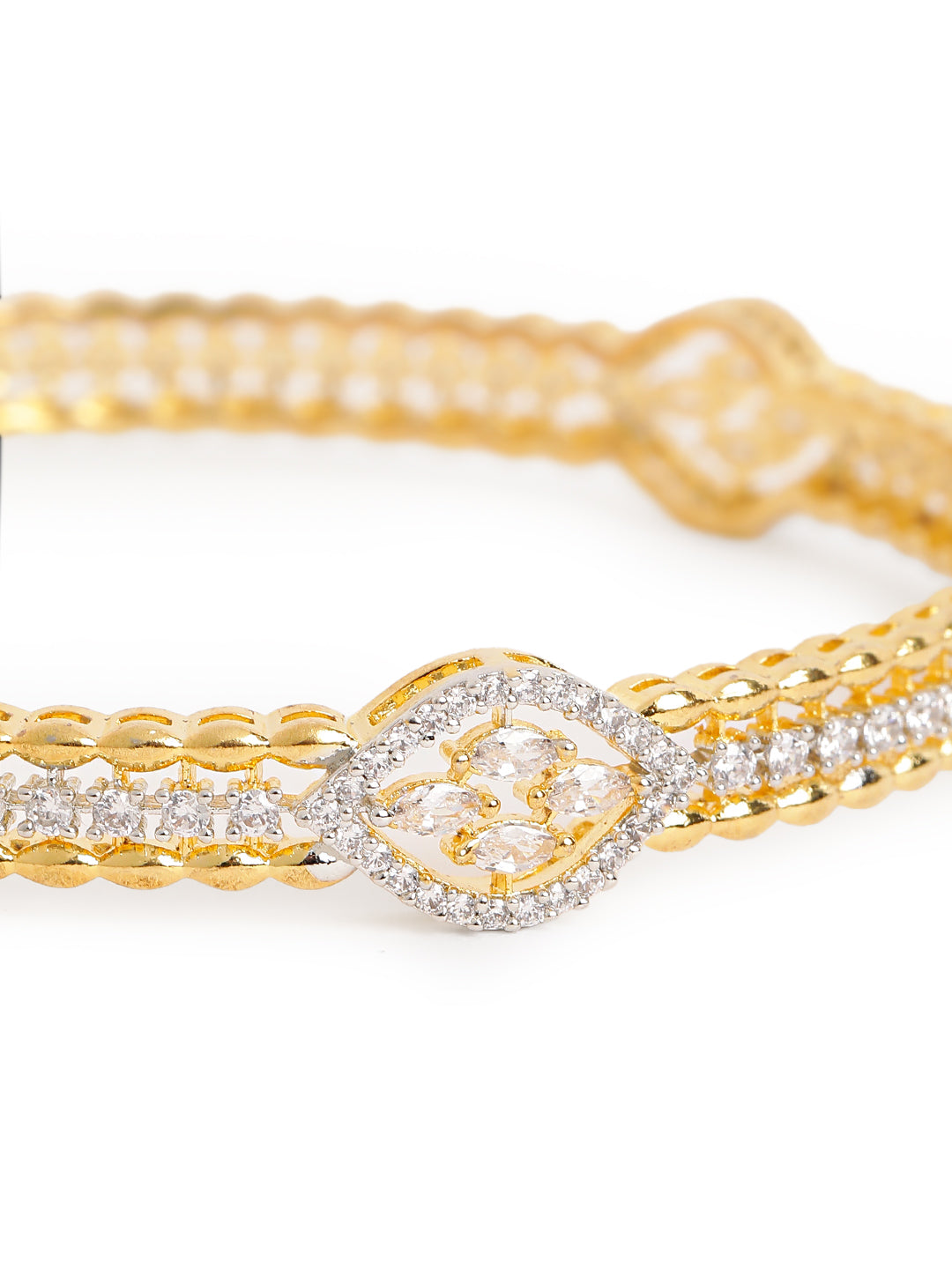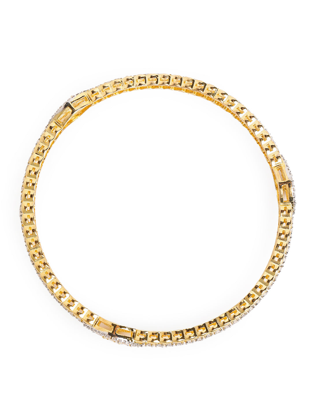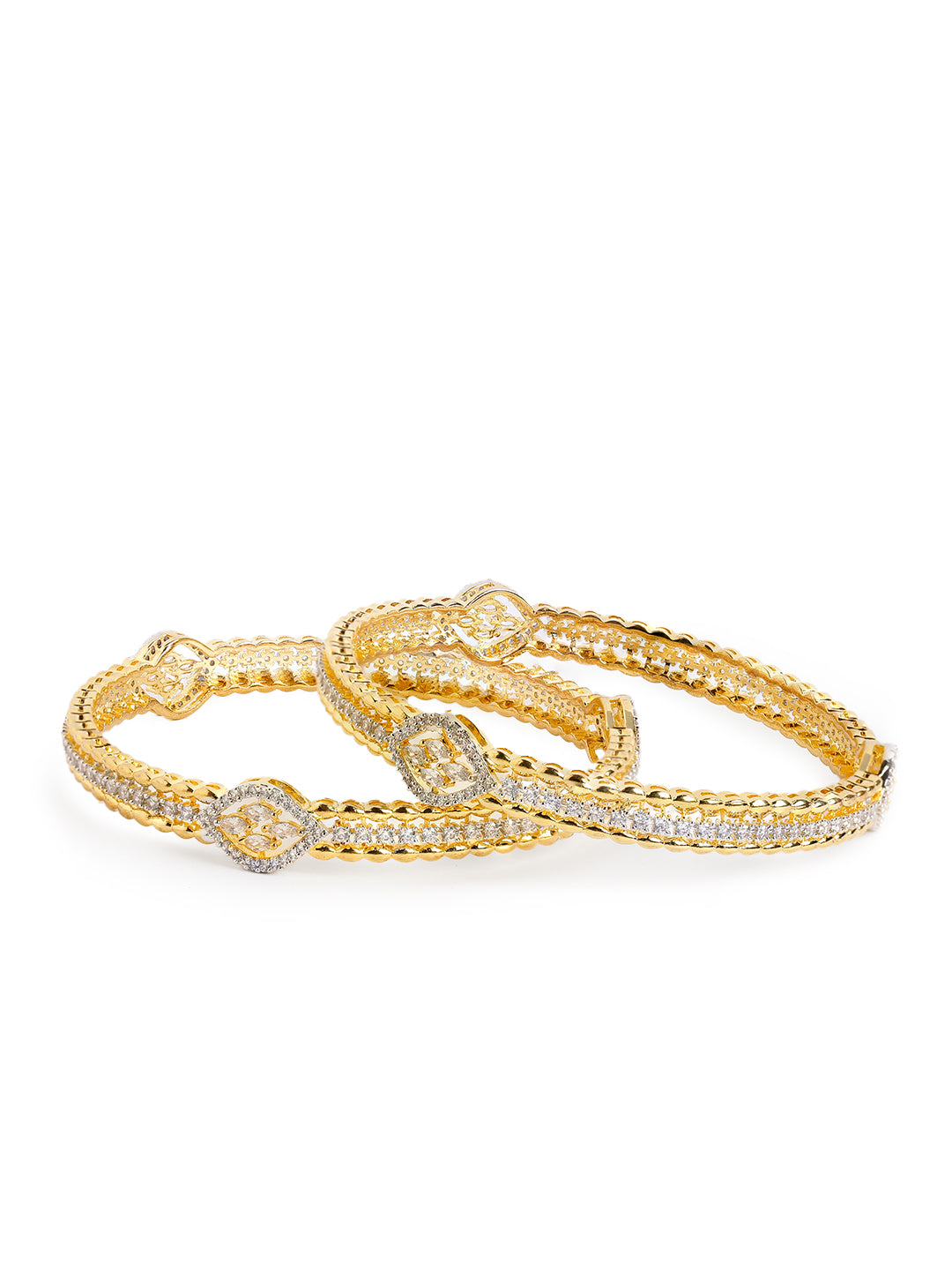 Elevate your festive and wedding look with these gold-toned bangles, crafted with delicate goldwork and encrusted with shimmering AAA Cubic Zircon stones. Their timeless design blends traditional elegance with modern shine, making them a versatile choice for sarees, lehengas, and even Indo-western outfits. This comes with 1 year plating warranty, anti-tarnish for lasting shine and comfort. Size upto 2.4, 2.6 & 2.8