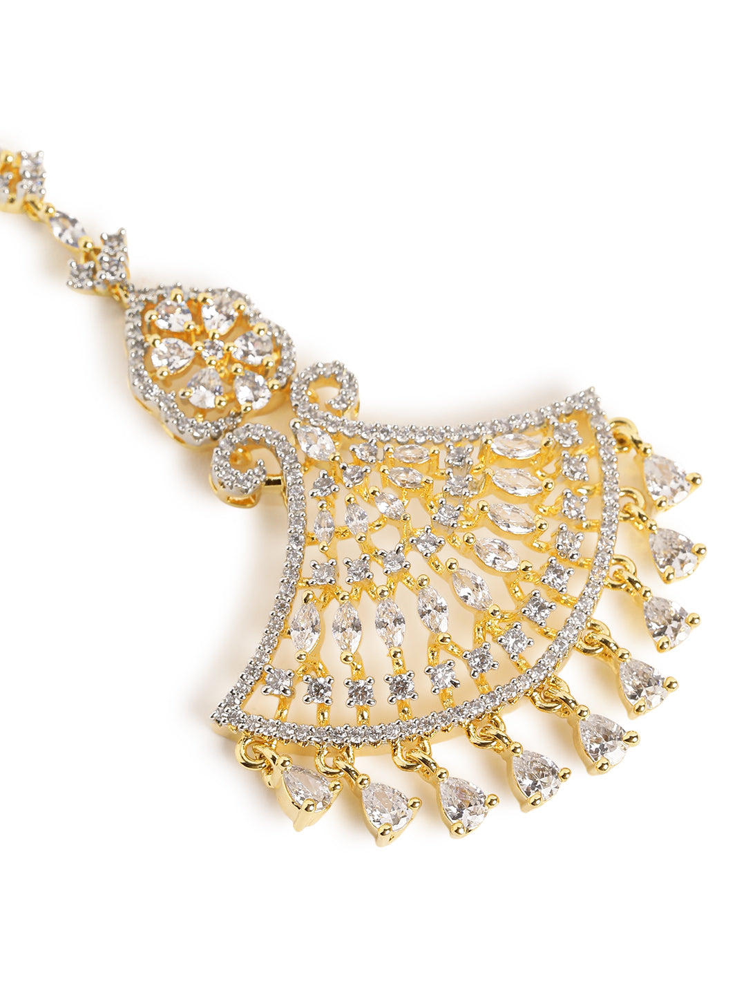 Intricately designed with clustered AAA Cubic Zircon, this maang tikka is finished with teardrop danglers, creating graceful movement with every turn. Perfect for brides and festive occasions, this piece blends traditional charm with contemporary brilliance. Secured with S-lock closure. This comes with 1 year plating warranty, anti-tarnish for lasting shine and comfort.