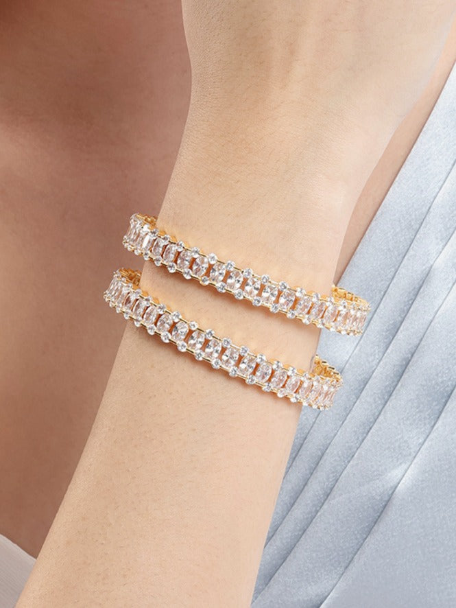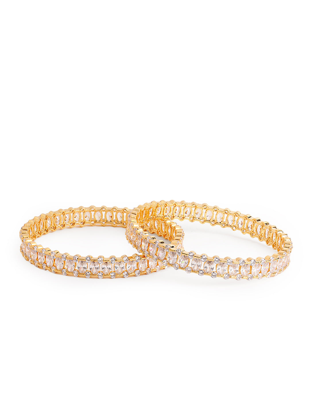 Make a grand statement with these double-row AAA Cubic Zircon stones studded bangles, crafted in a gold-toned finish with alternating oval and round-cut brilliance. Their bold yet elegant design makes them perfect for weddings, festive occasions, and high-glam evenings.This comes with 1 year plating warranty, anti-tarn