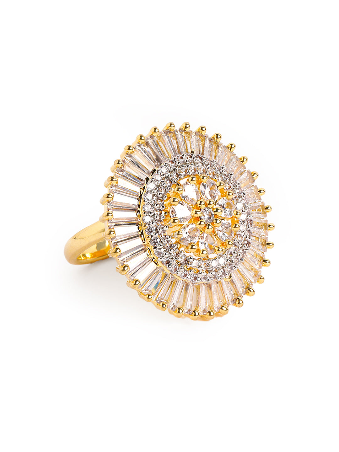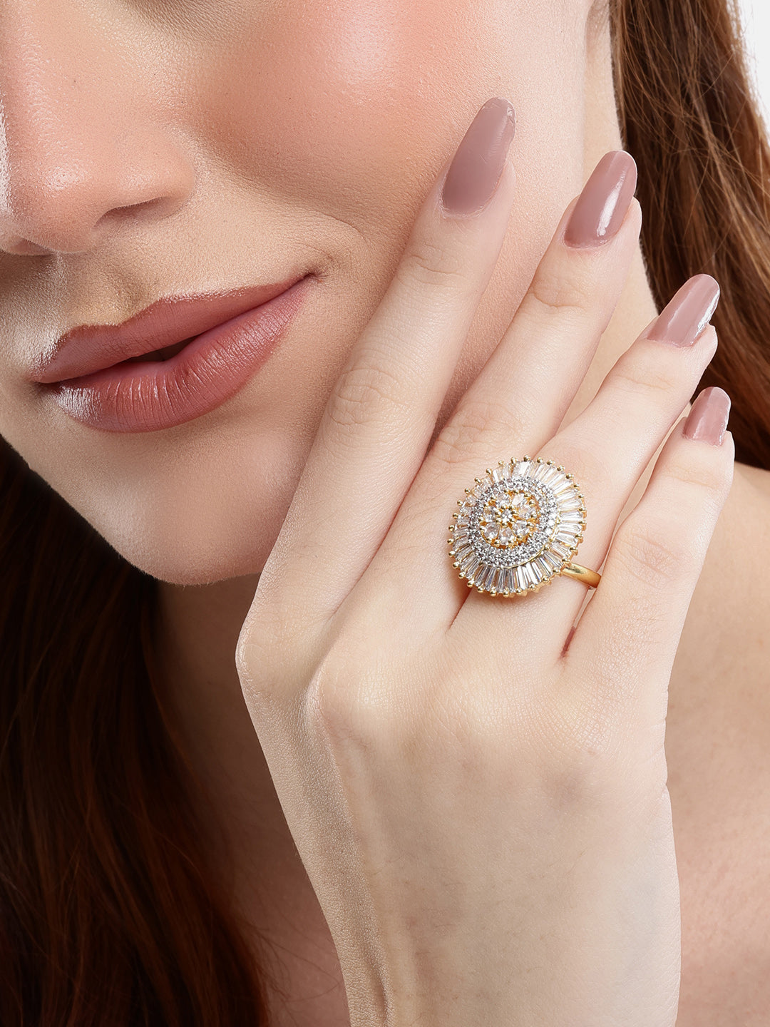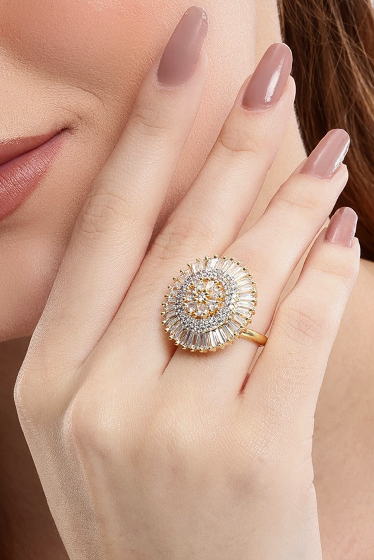 Make a dazzling statement with this sunburst inspired cocktail ring, featuring a radiant floral AAA Cubic Zircon stones cluster encircled by baguette-cut and brilliant stones. Its bold, luminous design makes it a perfect pick for weddings, parties, and grand celebrations. A ring that truly captures light and attention.