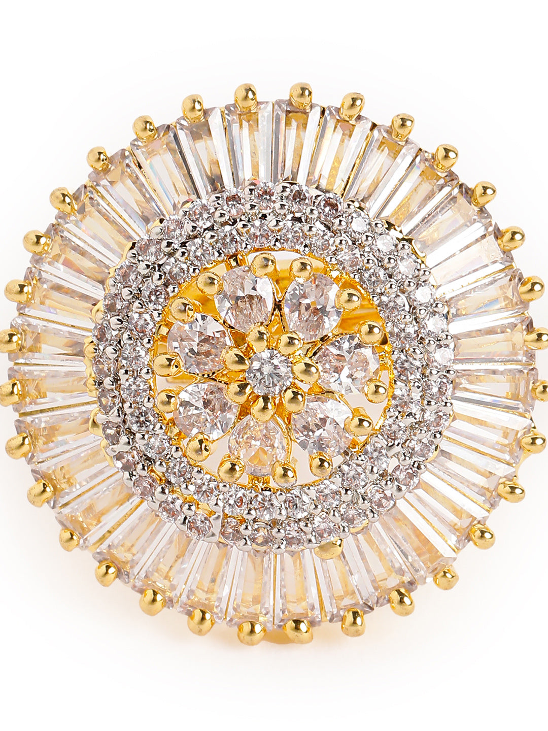 Make a dazzling statement with this sunburst inspired cocktail ring, featuring a radiant floral AAA Cubic Zircon stones cluster encircled by baguette-cut and brilliant stones. Its bold, luminous design makes it a perfect pick for weddings, parties, and grand celebrations. A ring that truly captures light and attention. Secured with adjustable closure. This comes with 1 year plating warranty, anti-tarnish for lasting shine and comfort.