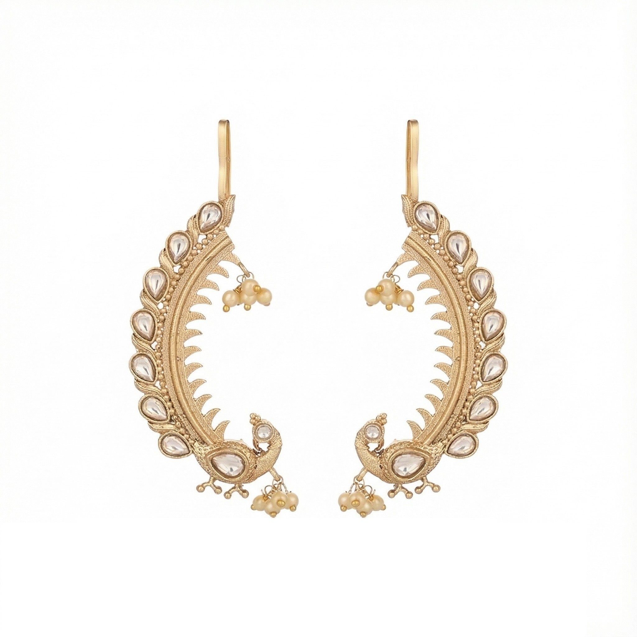 Gold toned, A regal ear adornment that curves elegantly along the ear, featuring peacock motifs and kundan accents. The matte gold finish enhances its royal appeal, making it a perfect no-piercing statement piece for festive and bridal looks. Secured with push back closure. This comes with 1 year plating warranty and a