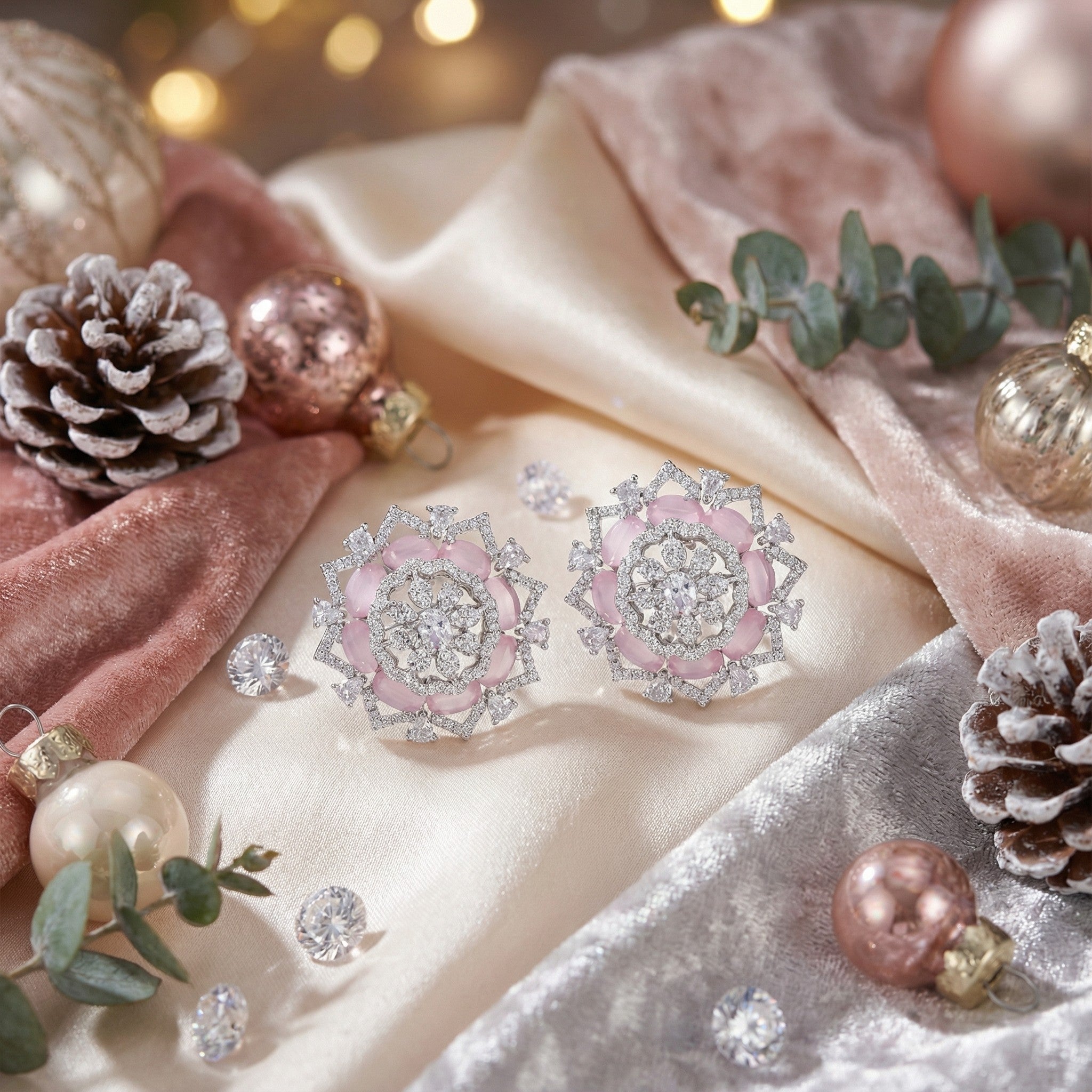 Rhodium Plated, a floral burst of brilliance, these pink american diamond stone studs are adorned with rose blush and clear stones in a stunning layered pattern. Crafted to catch light from every angle and add royalty to your look. Secured with push back closure. This comes with 1 year plating warranty, anti-tarnish fo