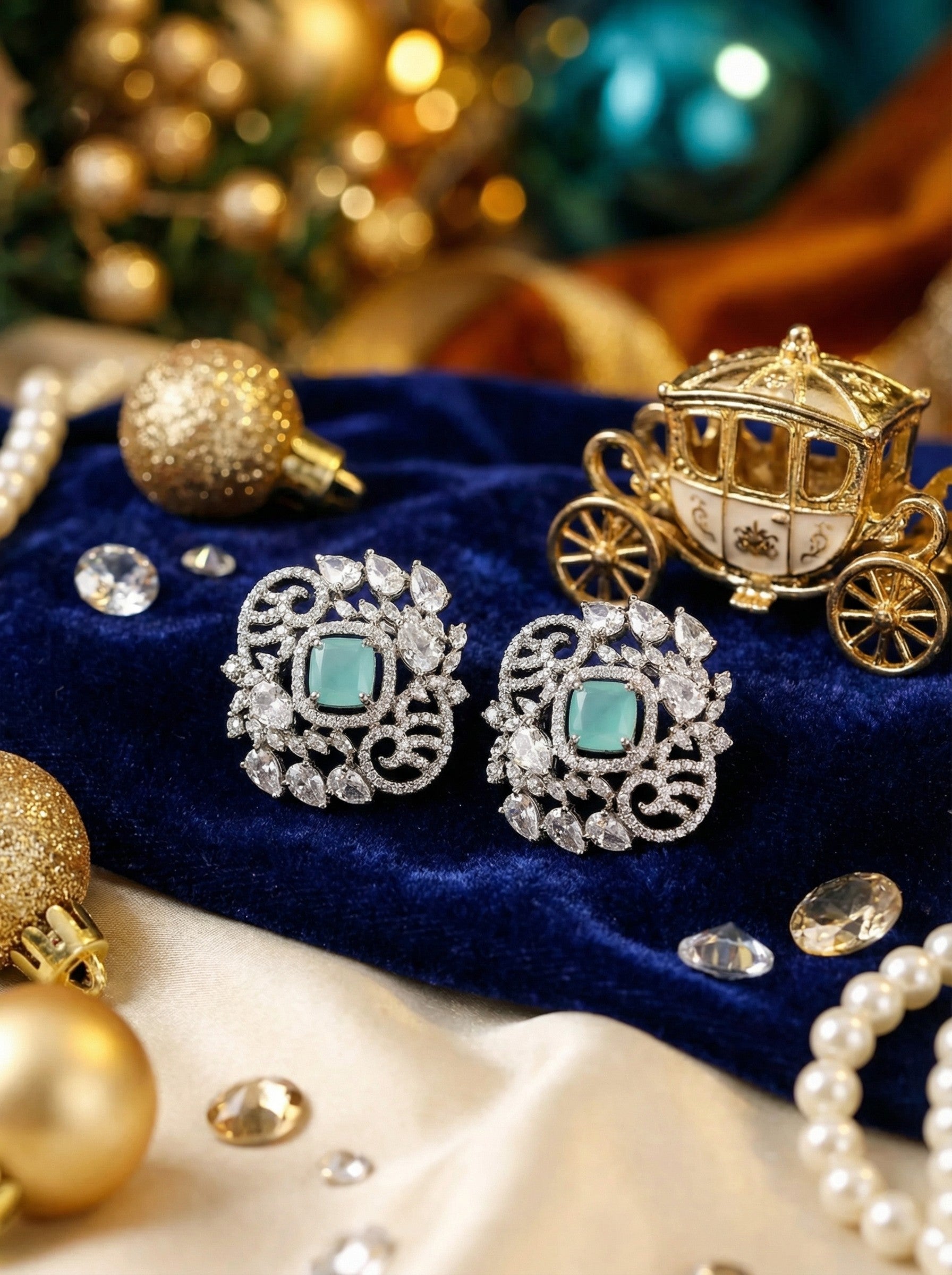 Rhodium Plated american diamond earrings, a floral burst of brilliance, these stone statement studs are adorned with mint green and clear stones in a stunning layered pattern. Crafted to catch light from every angle and add royalty to your look. Secured with push back closure.This comes with 1 year plating warranty, anti-tarnish for lasting shine and comfort.