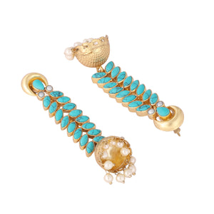 22 k Gold-toned contemporary shaped jhumkas has pearls & turquoise stone studded details. Secured with a post and back closure. 1 year plating warranty. Perfect for gifting to your loved ones.